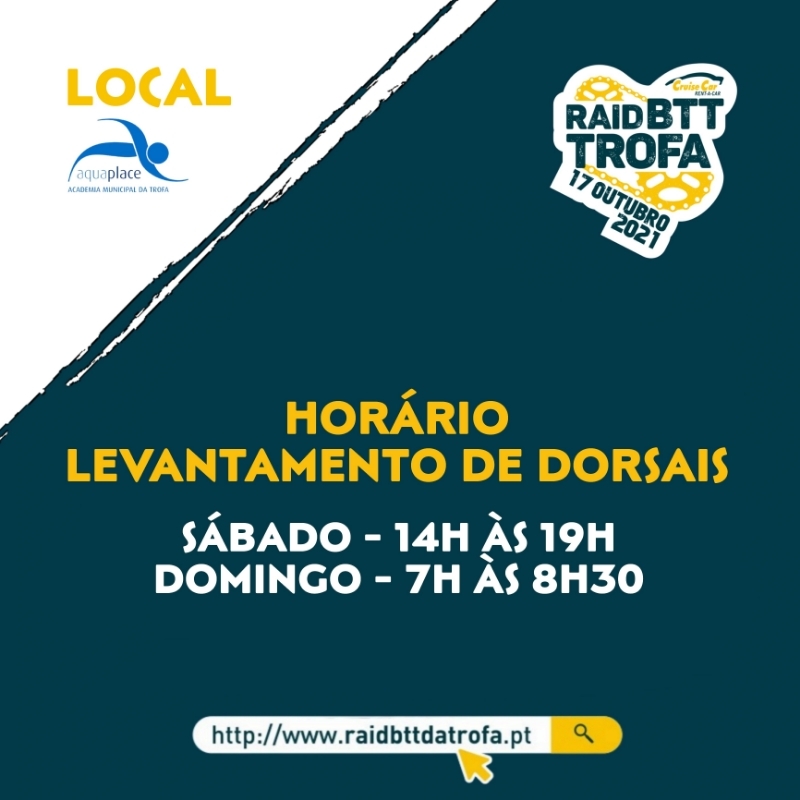 Levantamento de Dorsais: Sábado 16/10/2021 das 14h até às 19h Domingo 17/10/2021 das 07h até às 08h30 Local: Aquaplace - Academia Municipal da Trofa